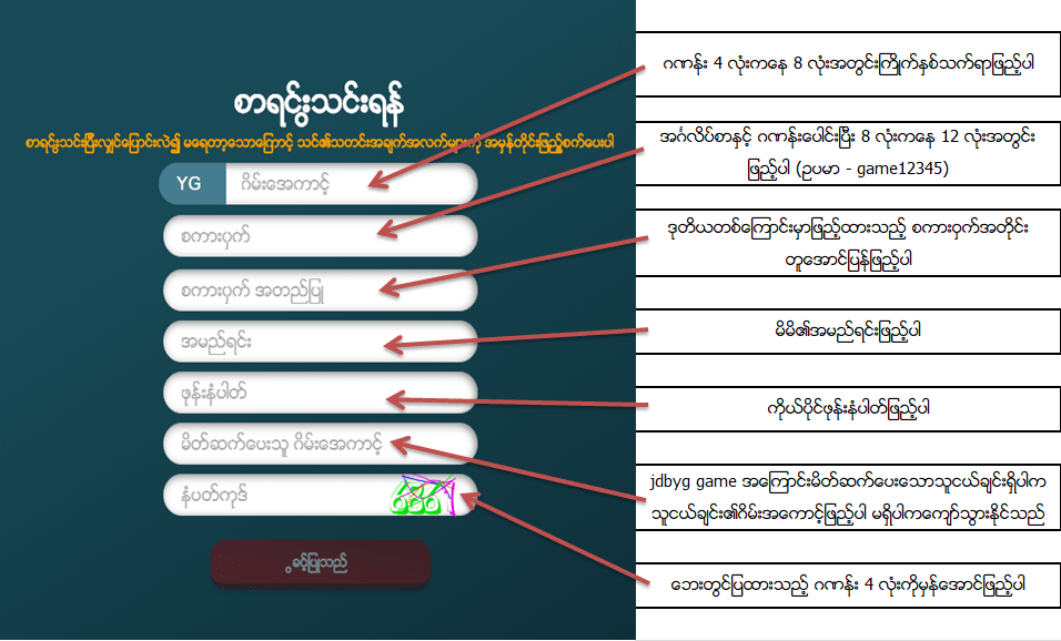 (1) Login ကိုႏွိပ္ပါ (2) New Member ကိုႏွိပ္ပါ ေအာက္တြင္ျပထားေသာဇယားအတိုင္းက်လာပါ နမူနာပံုကိုေသခ်ာဖတ္ရႈၿပီးစာရင္းသြင္းပါ။ ” အေကာင့္ဖြင့္ျခင္းေအာင္ျမင္သည္ ” ဟုျေပာလာပါက Level(1) အေကာင့္ရရွိၿပီျဖစ္ပါသည္။(ႀကိဳဆိုလက္ေဆာင္ အခမဲ့ 10000 ရယူရန္အတြက္ Level(2) တင္ရန္လိုအပ္ပါသည္)